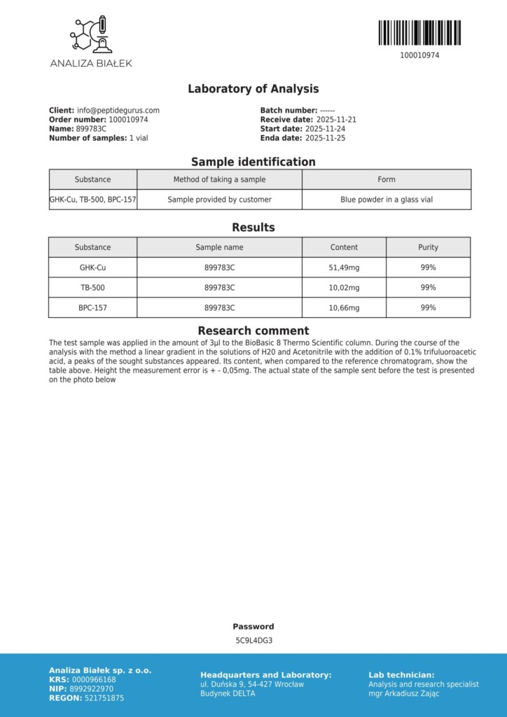 This blend is produced under strict quality systems with HPLC purity verification, mass balance testing, and low-endotoxin manufacturing protocols, making it suitable for organizations seeking high-stability peptides with dependable batch-to-batch consistency.